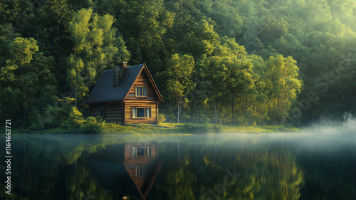 Obraz premium 湖畔に佇む森に囲まれた田舎の家