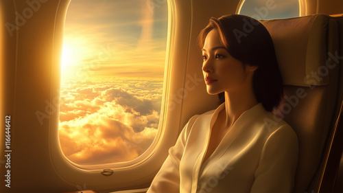 Fototapeta premium 朝日を浴びる機内の日本人女性