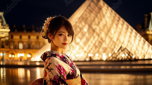 Fototapeta premium ルーブル美術館のライトアップと着物姿の女性が織りなす夜の美