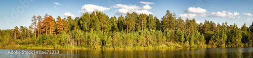 Obraz premium панорама летнего пейзажа соснового леса на берегу озера, Россия, Урал