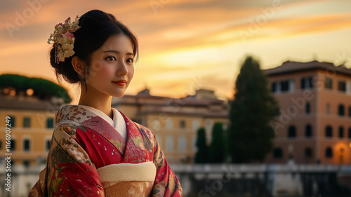 Fototapeta premium 夕暮れに包まれるベネチア広場と着物姿の日本人女性の優美な姿