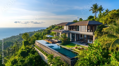 Fototapeta premium 熱帯の丘に佇む高級ヴィラとインフィニティプール