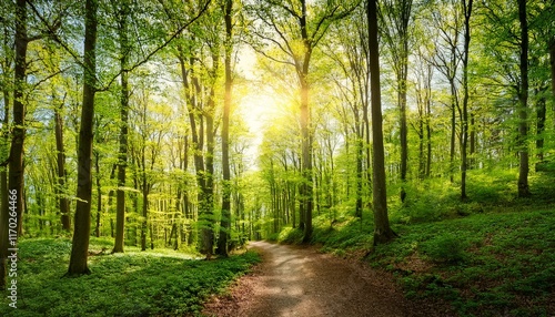 Obraz premium 緑の若葉が生い茂る林の中、小径に木漏れ日が差し込む、穏やかな春の風景