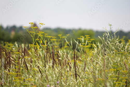 © alenuka, Obraz premium Луговые травы на фоне леса и неба