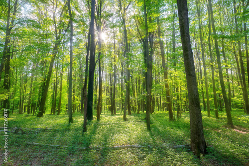 © WABISUKE, Fototapeta premium 太陽の光が差し込む森の中