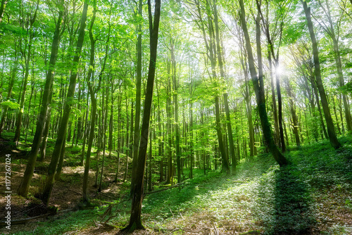 © WABISUKE, Obraz premium 太陽の光が差し込む森の中