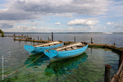 © androsov858, Fototapeta premium Две лодки на причале на берегу Горьковского водохранилища в летний день
