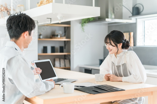 Obraz premium パソコンを使って説明を聞く主婦と説明する作業着姿の営業マンの男性