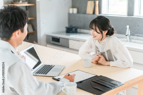 © buritora, Obraz premium パソコンを使って説明を聞く主婦と説明する作業着姿の営業マンの男性