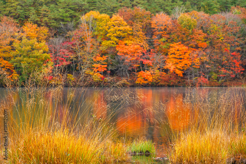 © Snoopy walk, Fototapeta premium 岸辺の紅葉