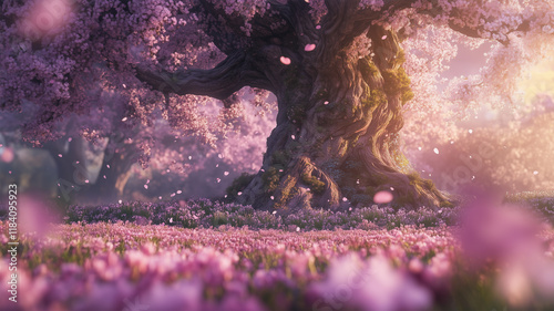 © bephoto, Fototapeta premium 満開の桜と春の花畑にそびえる荘厳な大木