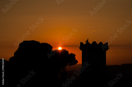 Obraz premium Силуэт птицы на башне на фоне заходящего солнца