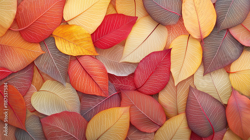 Naklejka premium 秋の落ち葉が織りなす色鮮やかな模様と葉脈の美しさ
