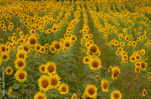 Obraz premium 畑に広がるヒマワリの群生 畑に無数に咲き誇るヒマワリが鮮やかだ。