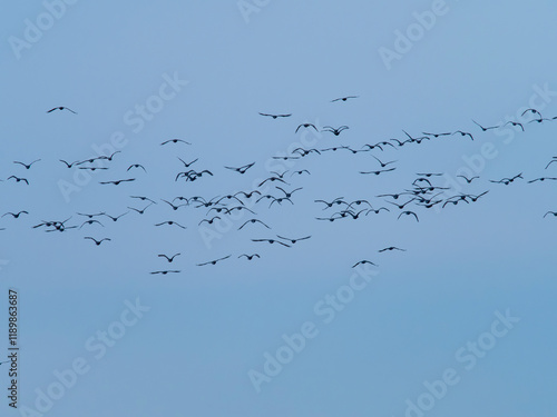 Fototapeta premium 青空を飛ぶ川鵜の群れ
