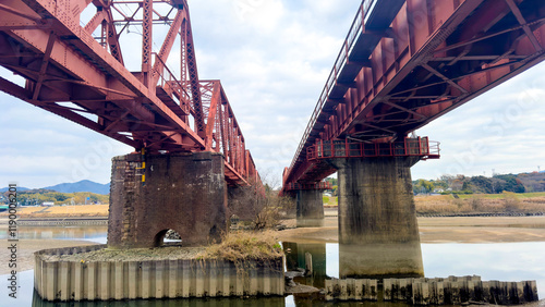 Naklejka premium 菊池川を渡る赤い鉄道橋