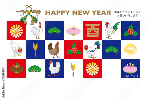 Fototapeta premium にわとりとしめ縄のモダンなイラストの2017年酉年の年賀状テンプレート素材