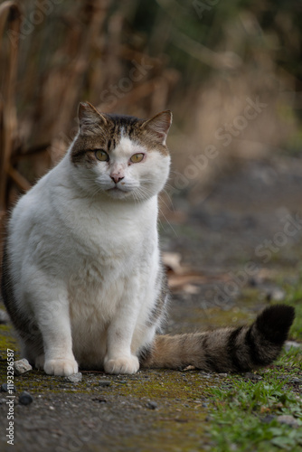 © AnagoSagari, Obraz premium 自然公園にいる尻尾が太くてしましまのレッサーパンダみたいなキジトラ柄とぶち猫柄の野良猫