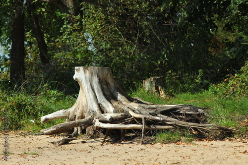 © heshixin, Obraz premium Старый сухой пень на песчаном побережье