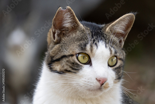 Obraz premium ぽわっと柔らかい雰囲気のキジトラ柄の野良猫のどアップした顔