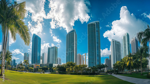 Obraz premium 近代的な高層ビル群と熱帯植物が調和する都市風景