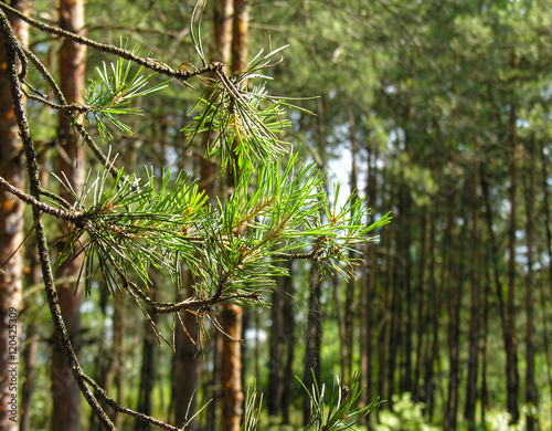 Obraz premium Паук свил паутину на сосновой ветке в лесу