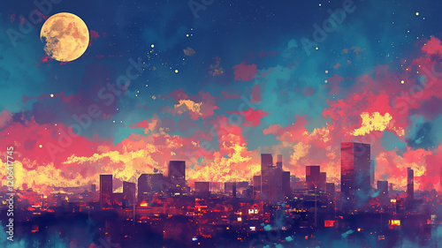 © 963k, Fototapeta premium 都会のシルエットと夜空に輝く星々と月。優しい水彩画タッチの美しいアート。