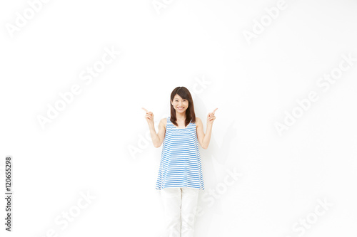 © siro46, Fototapeta premium 女性 両手指差し 白背景 コピースペース