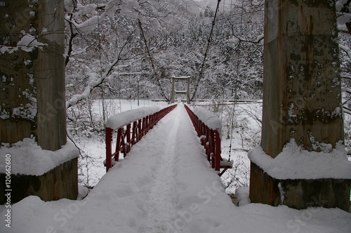© amosfal, Obraz premium 雪の秋田県抱返り渓谷のつり橋
