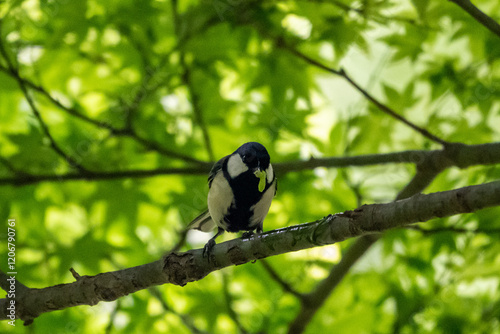 © sf-photo, Fototapeta premium 新緑の木陰でエサの芋虫を咥えるシジュウカラ