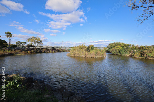 Obraz premium 맑은하늘 숲안에 물이 고여있는 연못 풍경 제주 서귀포시 대정읍 보성리 봉우못