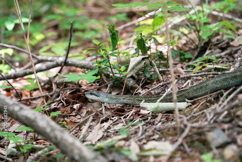 Obraz premium 草むらを這うシマヘビ