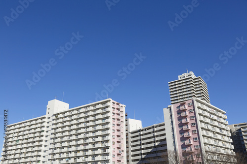 Naklejka premium 団地とマンション 東京都心の住居イメージ 青空 コピースペース