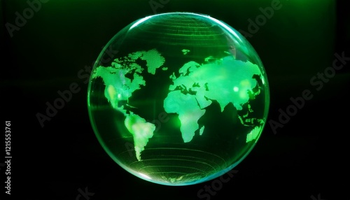 © 순단 강, Fototapeta premium 투명한 구체 안에 떠 있는 세계 지도에서, 특정 한 대륙이 형광 초록빛으로 빛나는 모습