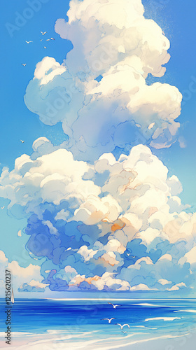 Fototapeta premium 鳥が行き交う美しい海のイラスト。1980年、1990年代の古く懐かしい日本のアニメをモチーフにしたイラスト。柔らかな水彩タッチで描いている。スマートフォン9:16のアスペクト比
