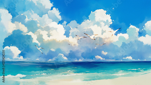 Obraz premium 大きな夏の雲、美しい青い海、鳥が行き交う日本の初夏の海。1980年、1990年代の古く懐かしい日本のアニメをモチーフにしたイラスト。柔らかな水彩タッチで描...