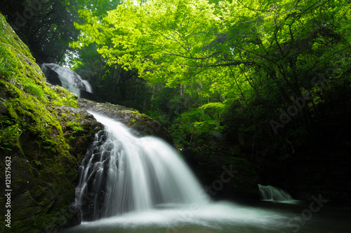 Obraz premium 滝と新緑(愛媛県久万高原町遅越の滝)