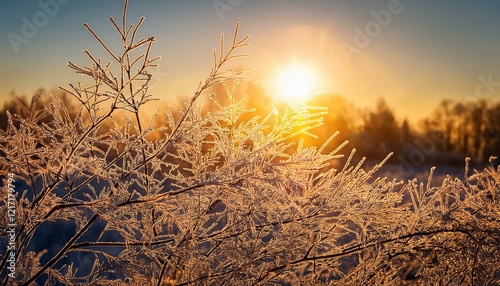Fototapeta premium 霜に覆われた木の枝をゴールドの朝焼け