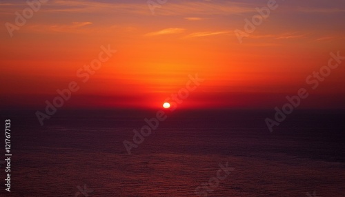 © 순단 강, Fototapeta premium 멀리 수평선 위로 떠오르는 선명한 일출, 붉고 따뜻한 색감의 태양