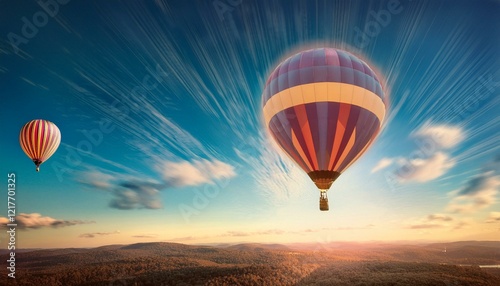 Naklejka premium 뜨거운 공기 풍선이 떠오르는 모습, 고도가 높아질수록 풍선의 색이 점점 밝아지는 표현