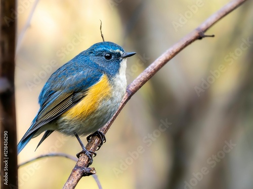 © STOCK THE WORLD, Obraz premium 森の中の木陰で枝に留まって周りを見渡しているルリビタキの雄