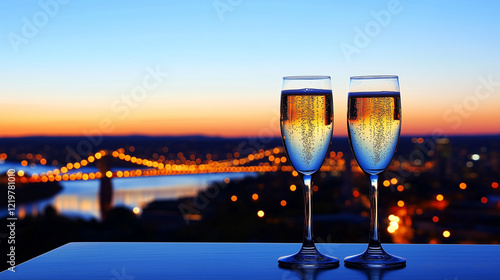 © daaakomo, Obraz premium 夜景とスパークリングワイン