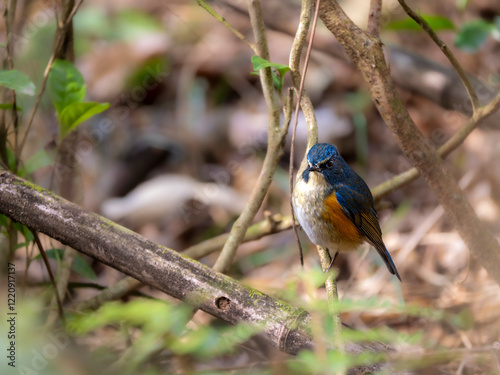 © STOCK THE WORLD, Obraz premium 森の中で枝に留まって周りを見渡しているルリビタキの雄