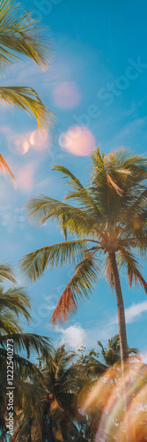© Ice Cream Paradise, Fototapeta premium 眩い太陽を反射し 夏の青空に映り込むレンズフレアの光の効果とヤシの木、コピースペースあり