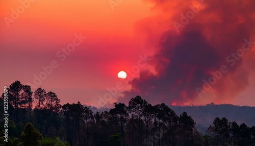 Fototapeta premium 산불이 숲을 태우며 번지는 장면, 하늘은 붉은색과 검은색으로 물들어 있고, 연기가 공중에 가득함