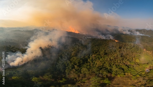© 순단 강, Fototapeta premium 산불이 숲을 태우며 번지는 장면, 하늘은 붉은색과 검은색으로 물들어 있고, 연기가 공중에 가득함