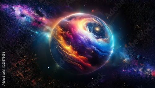 Obraz premium 암흑 공간에 떠있는 독특한 색상의 구형 행성