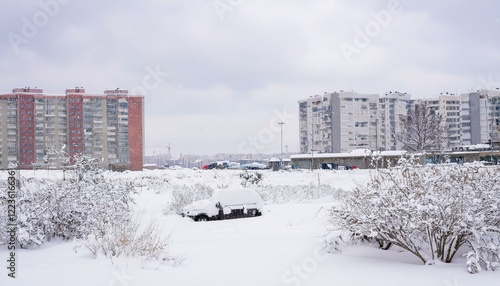 Obraz premium 폭설로 인해 도시가 눈에 파묻힌 모습, 건물들과 차량들이 눈 아래에 묻혀 있다