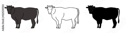 © Mercer, Fototapeta premium 黒い牛の手書きベクターイラストセット。黒毛和種の牛を漫画風に描いたアイコン。