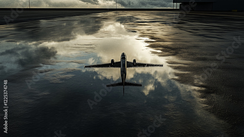 © bephoto, Naklejka premium 雨上がりの滑走路に映る飛行機のシルエットが織り成す美しい風景